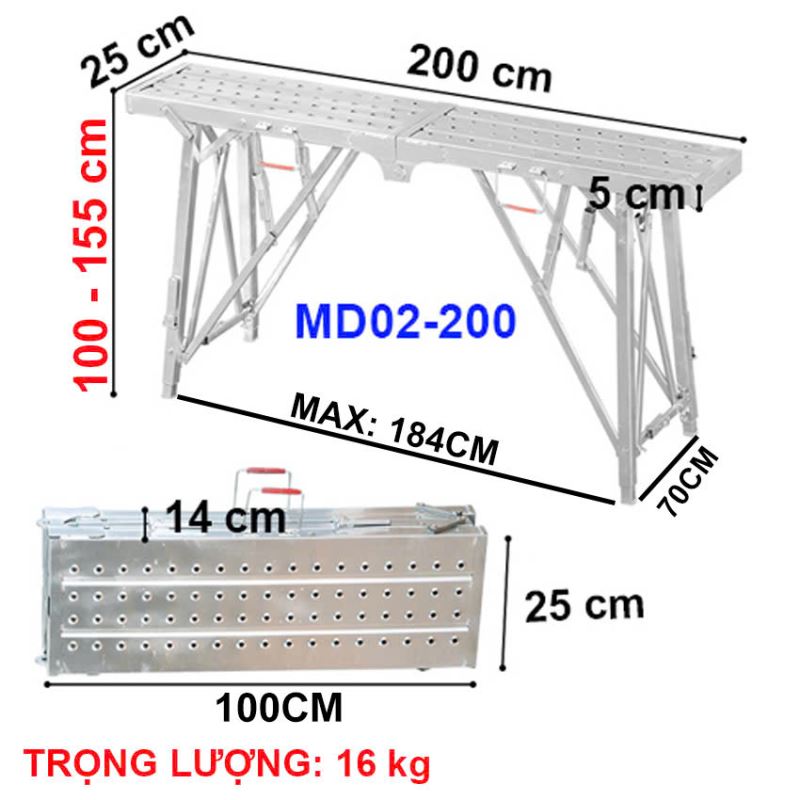 – Kích thước sử dụng: 200 x 25 x 100 – 155 Cm ( D x R x C )